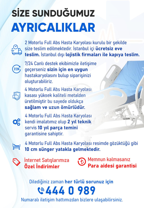 Bu 4 Motorlu Hasta Karyolası Full Abs Asansörlü, birçok özellikle donatılmış bir hasta karyolası olarak dikkat çekiyor. İşte bu karyolanın bazı özellikleri: